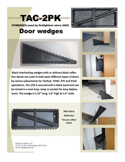 The TAC-2PK is for use in tactical operations or on the fire ground where doors need to be held open at various positions. The wedges are available in black with or without black reflective decals. The two wedges give emergency services personnel the ability to use in an interlocking configuration.